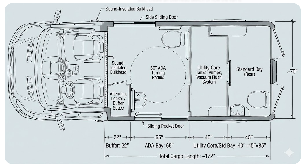 Each Bay is built on a Ford Transit high-roof extended van chassis — clean, climate-controlled, and purpose-built.